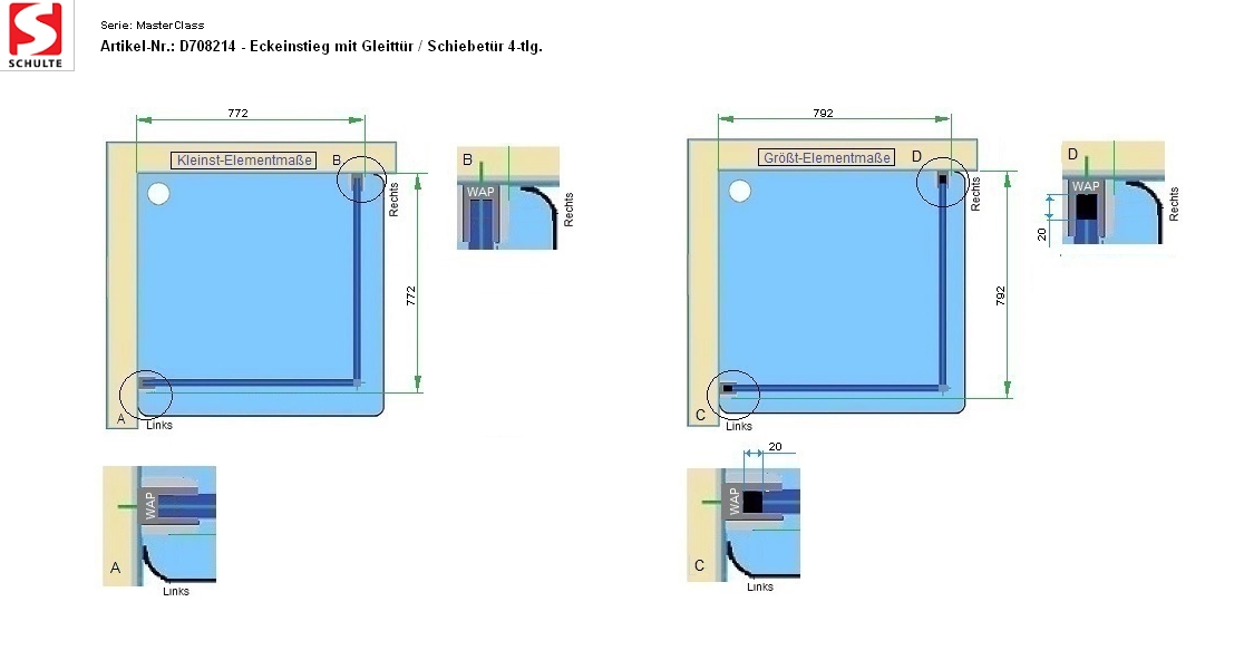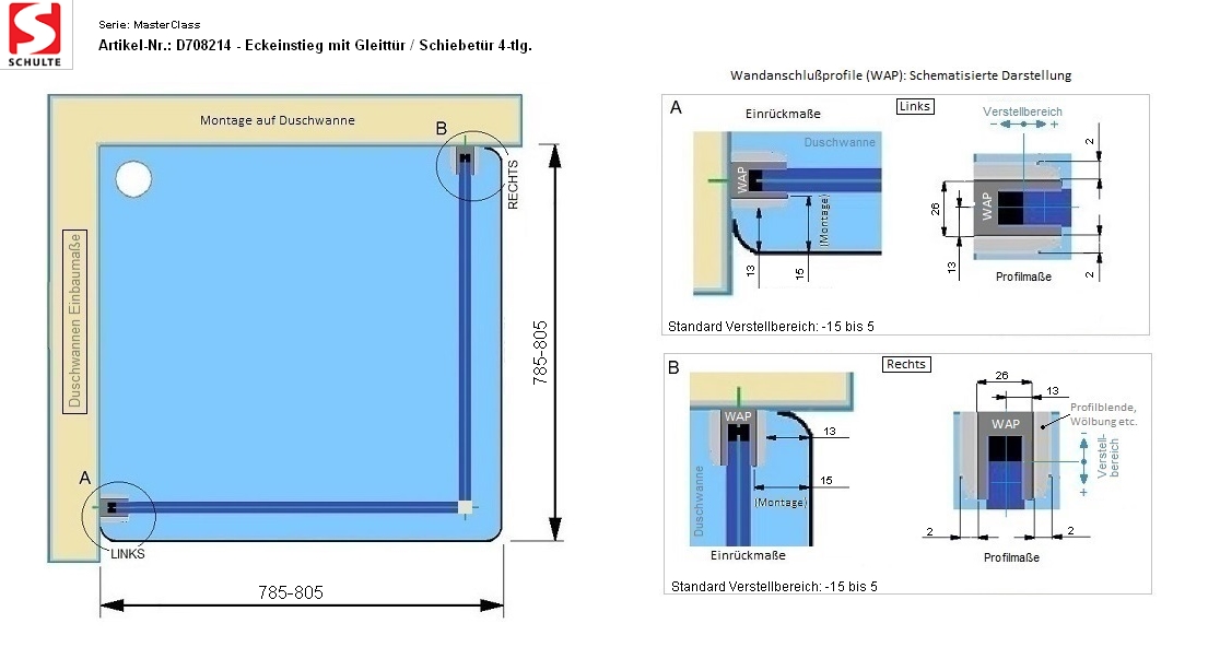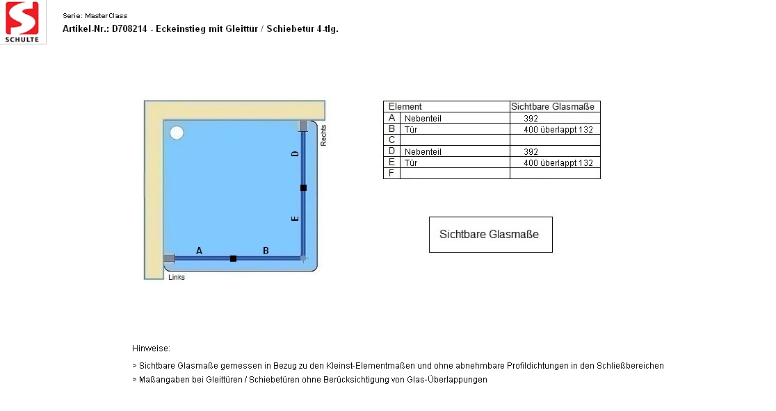 MasterClass - Schiebetür als EckeinstiegDuschkabinenserie MasterClass Die Serie MasterClass gilt als Luxusklasse der Marke Schulte. Die teilgerahmte Optik der Duschkabinen mit innenbündigen Scharnieren bietet den praktischen Vorteil, dass die Duschabtrennungen ausgesprochen pflegeleicht sind; Schmutz und Kalk können sich nur schwer absetzen. Außerdem ist eine ebenerdige beziehungsweise barrierefreie Montage auf Fliesen sowie eine Montage auf unseren Duschwannen bei allen MasterClass-Modellen möglich. Sie haben zudem die Wahl die Duschkabine mithilfe der mitgelieferten Montageanleitung selbst anzubringen oder unsere fachkundigen Monteure zu buchen.