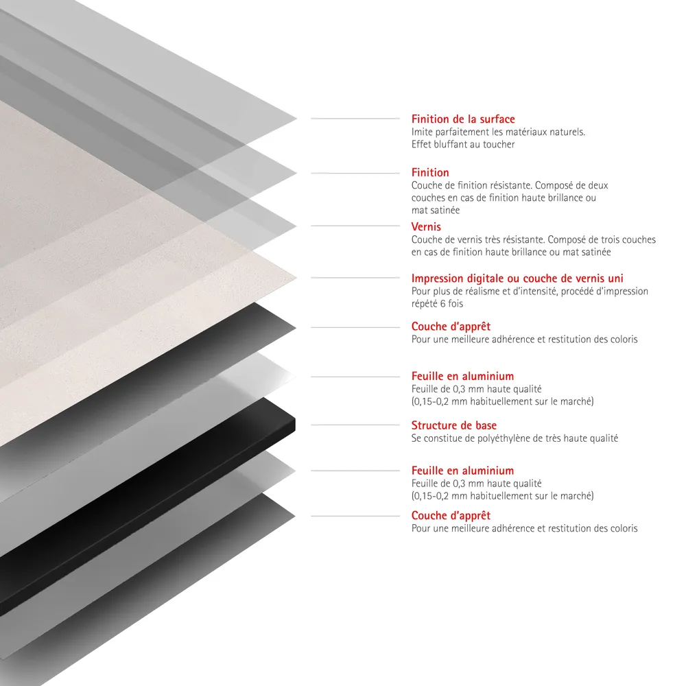 - Décor : surface mate à léger relief. Effet matière très réaliste. Rendu esthétique et tendance.
