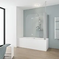 Pare-baignoire 2 volets avec paroi latéraleIncontournable pour ne pas renoncer aux plaisirs partagés d’un bain et d’une douche, ce pare-baignoire d'angle se veut intemporel. Les volets pivotants se rabattent contre la paroi latérale pour faciliter l’accès. Idéal contre les petites inondations dans la salle de bains.