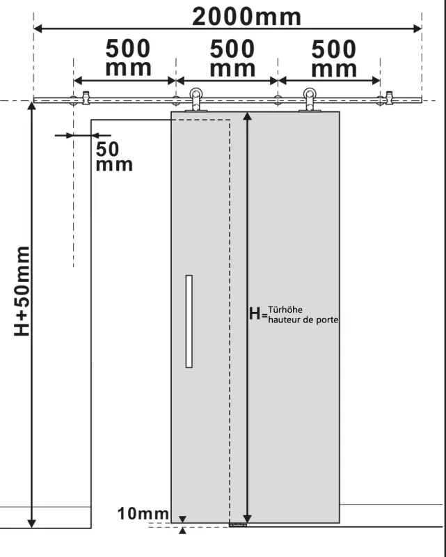 Comprend rail de guidage, 2 poignées, un guide au sol, une butée, des roulettes et un support de montage.