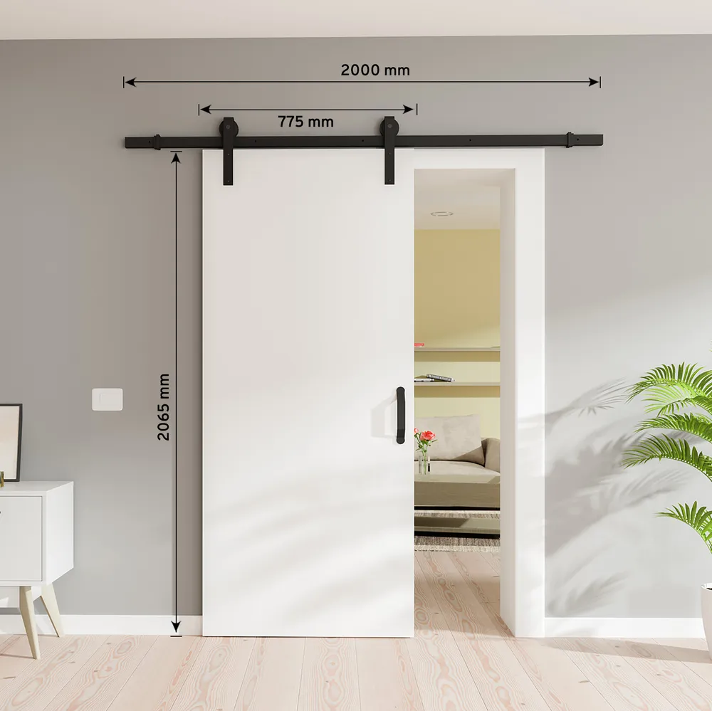 Porte coulissante en bois, 77x206cm, porte intérieure pleine, bois blanc, rail apparent noir