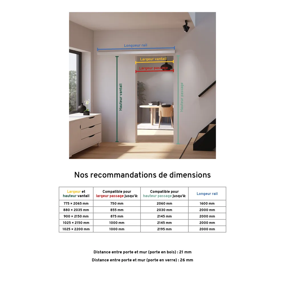 - Livré avec Rail de 2m redécoupable, Poignée, Guide au sol, Système de fixation