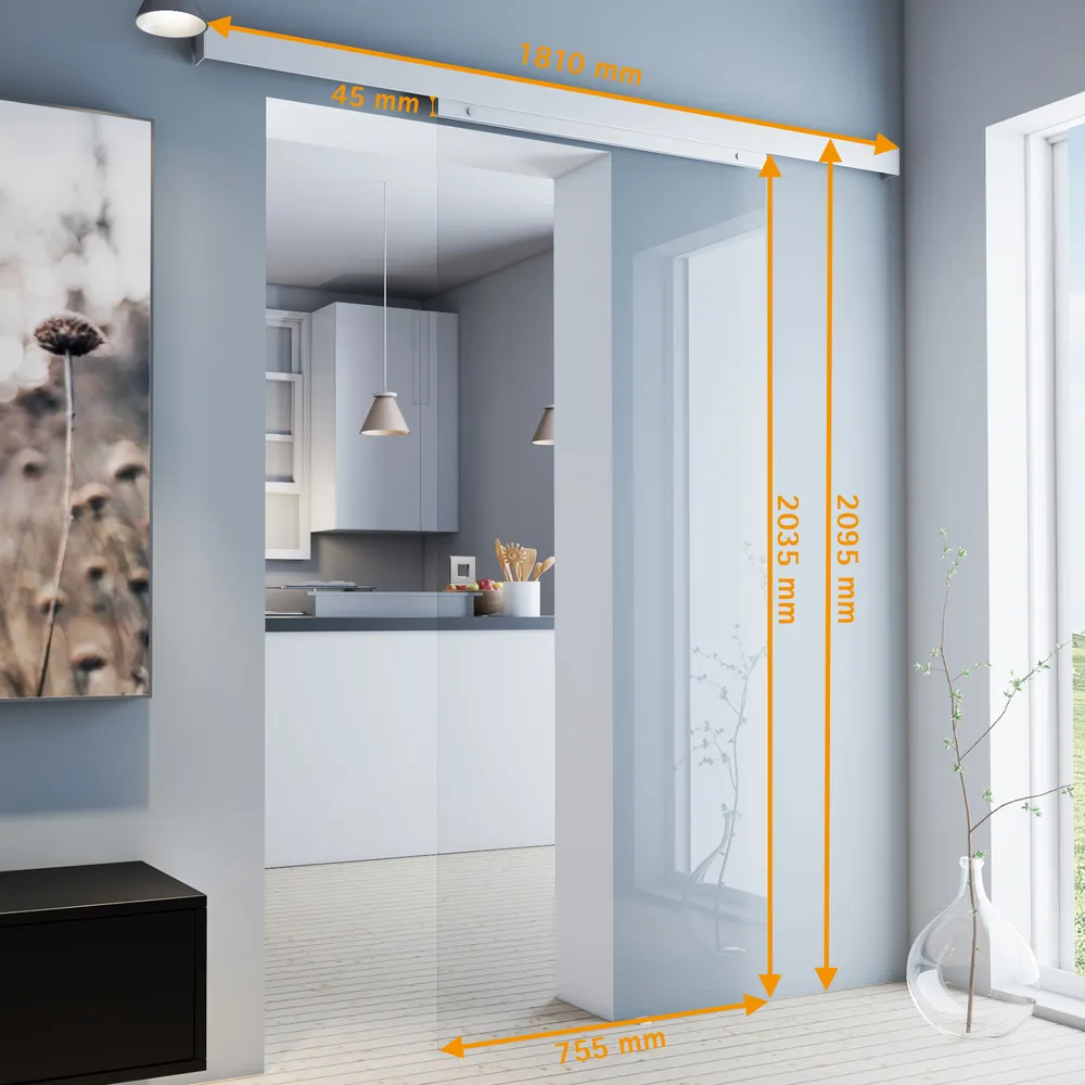Porte coulissante intérieure en verre, 75 x 203 cm, verre transparent, poignée carrée